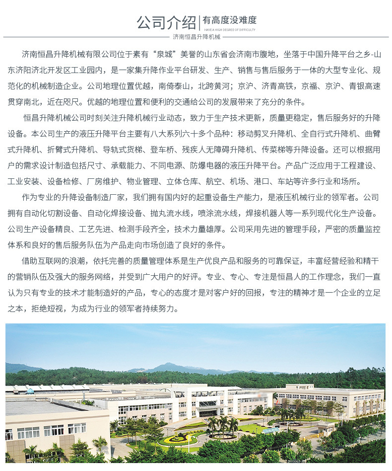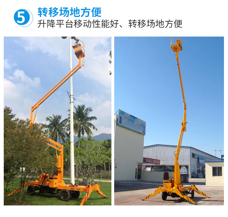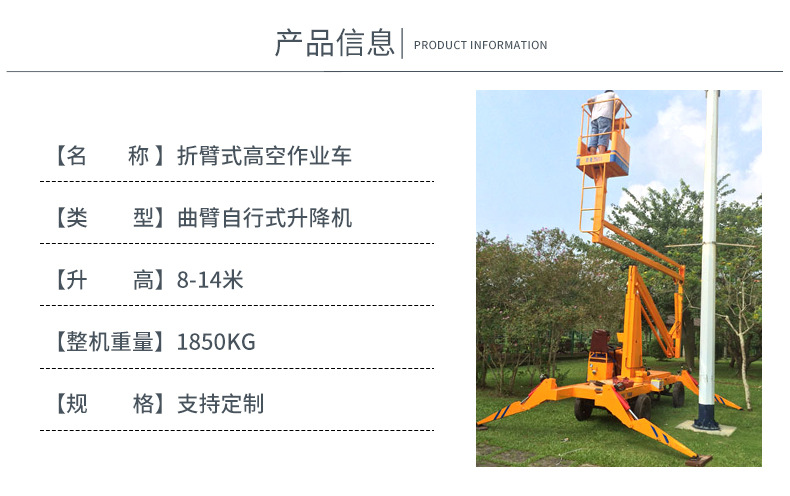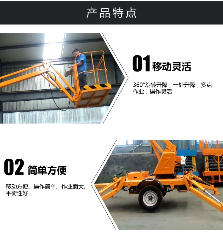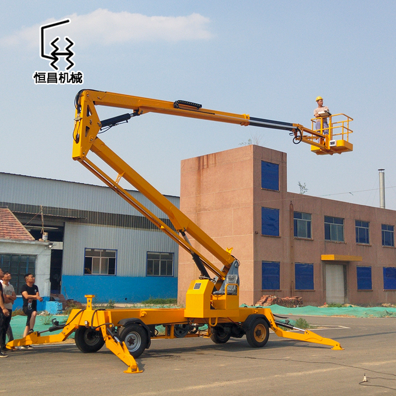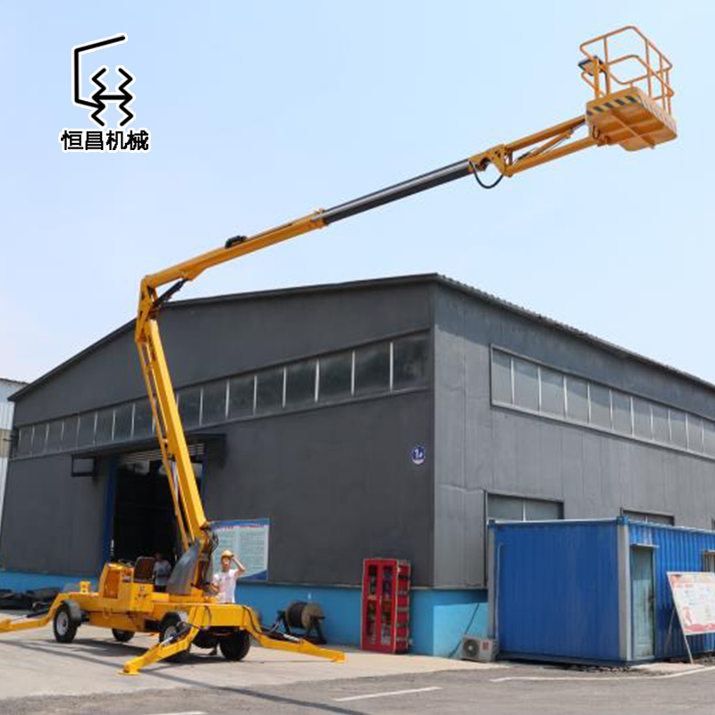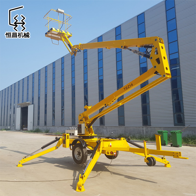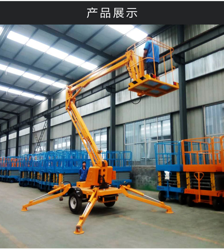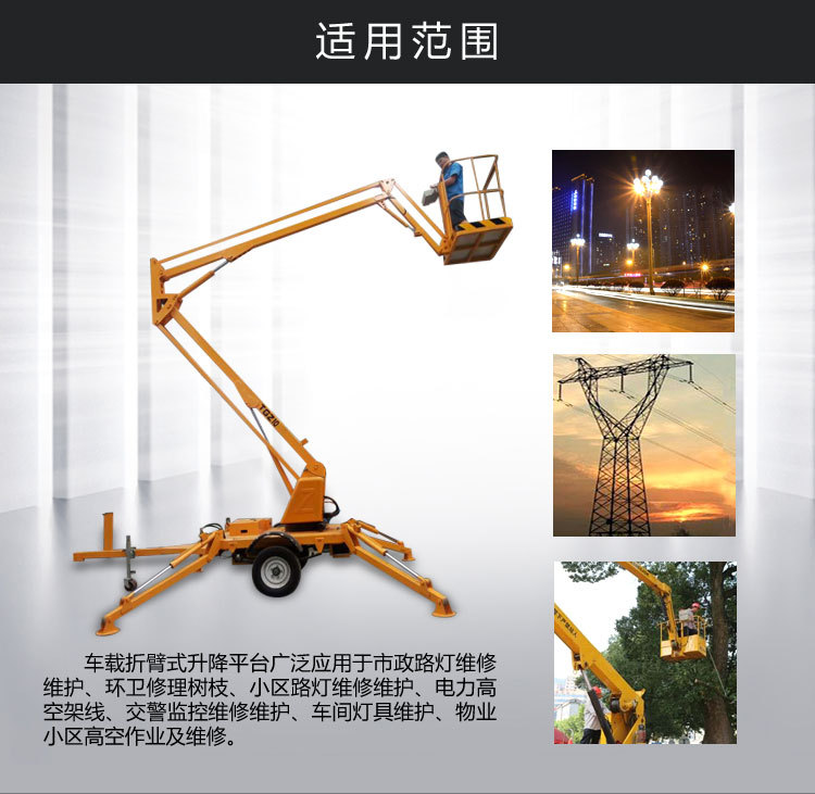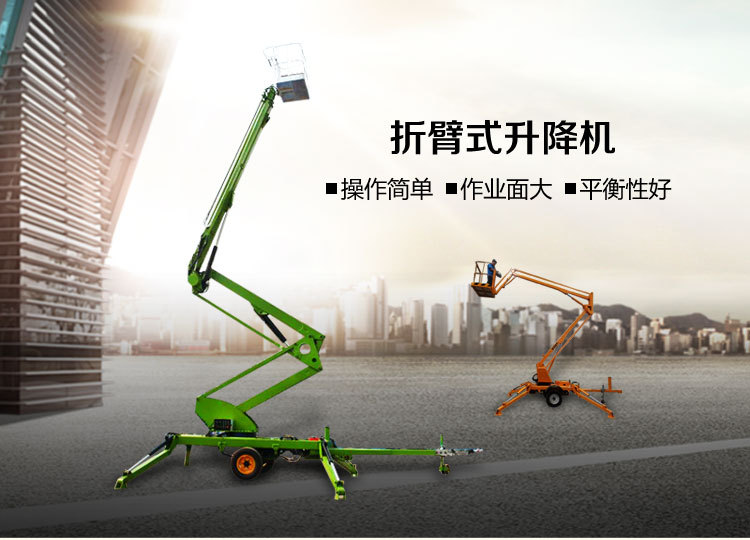 當前,折臂式升降機,是一種360°旋轉升降送行人或貨物的液壓升降工具。折臂式升降機具有移動方便、操作簡單、作業面大、平衡性能好等特點,在路面不平的情況下,即能四腿同時支撐,也可單腿支撐,便于操作使用,因而廣泛應用于消防、市政、電力、路燈、廣告、通訊、攝影、園林、交通、碼頭、機場港口、大型工礦企業等行業的安裝維修及登高作業。